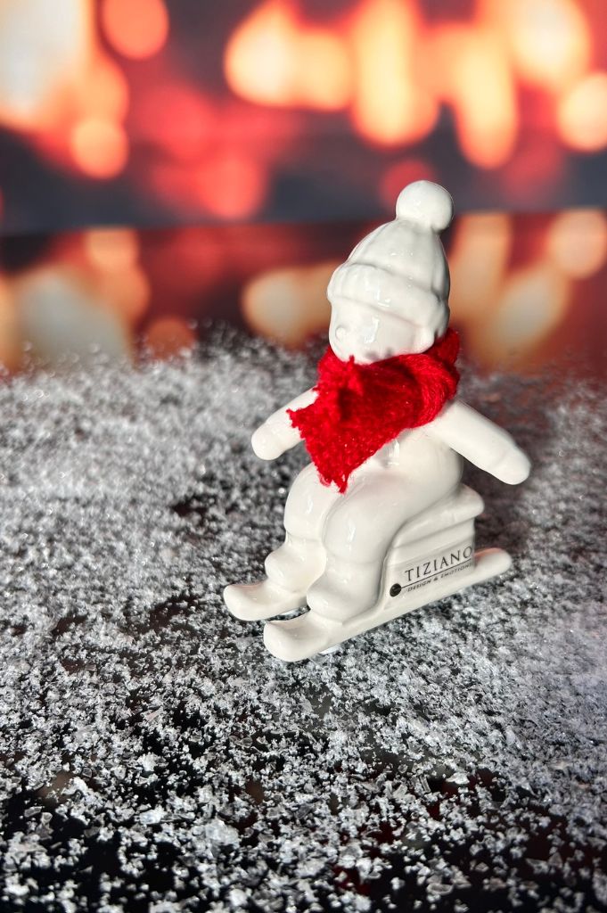 Entdecke das Kind Antea, dass auf seinem Schlitten den Berg hinuntersaust. Antea trägt einen roten Schal (Wolle) und eine Mütze (fest angebracht aus Keramik).