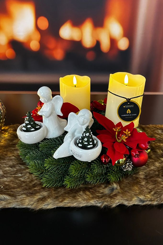 Die beiden Engel, liebevoll gestaltet, verleihen dem Kranz eine ruhige und besinnliche Note, während die LED Kerzen ein sicheres und stimmungsvolles Licht schaffen. Ergänzt durch Tannenzweige, rote Weihnachtsblumen und dekorative Kugeln wird der Kranz zu einem festlichen Highlight auf jedem Tisch.
