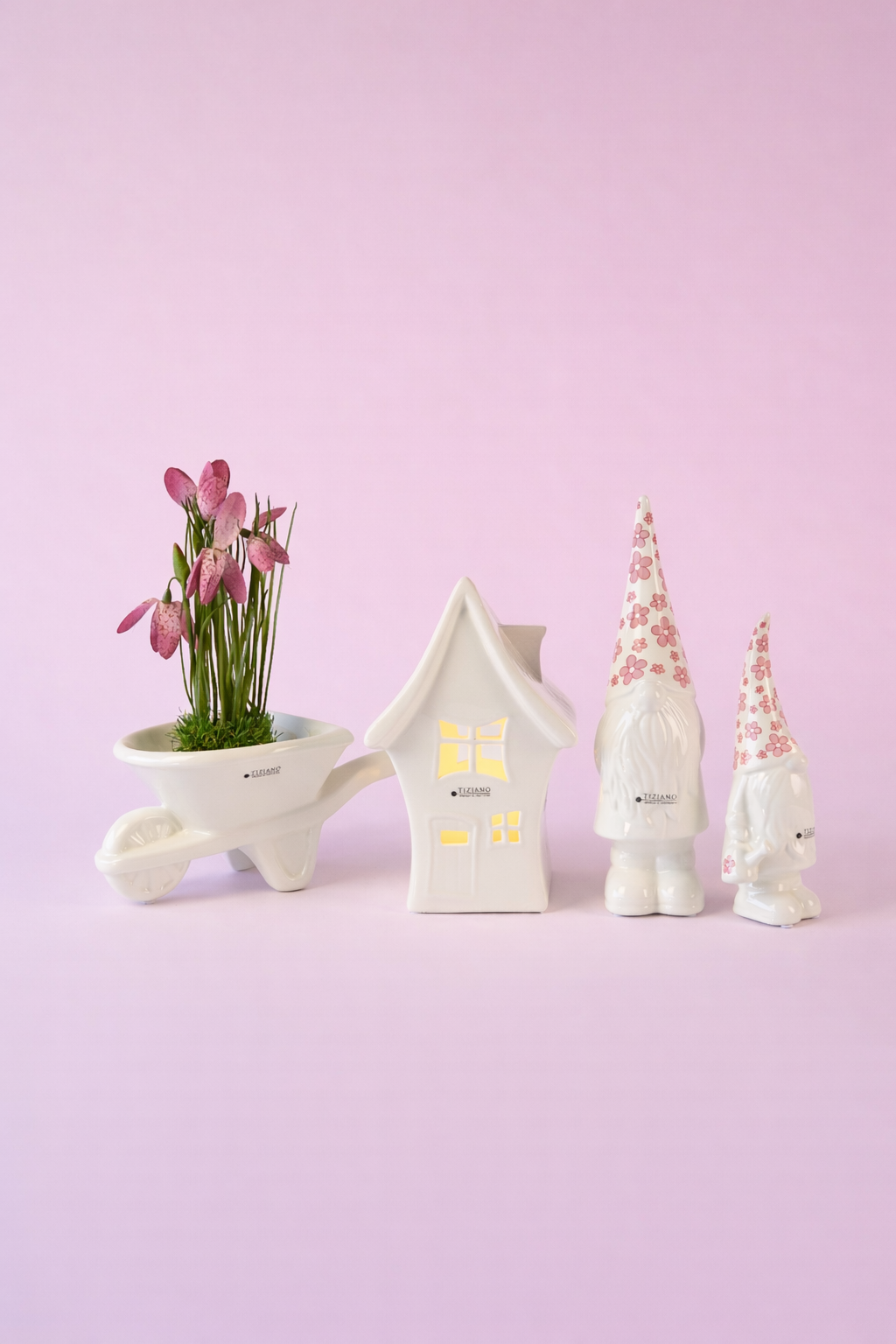 Das Dekoset „Blumige Zwergenidylle rosa“ eignet sich ideal für Fensterbänke, Sideboards oder Kommoden und überzeugt durch seine harmonische Farbgebung, liebevolle Details und das ausgewogene Zusammenspiel aus Keramik, Licht und floralen Elementen – perfekt für eine fröhliche und stilvolle Frühlingsdekoration.